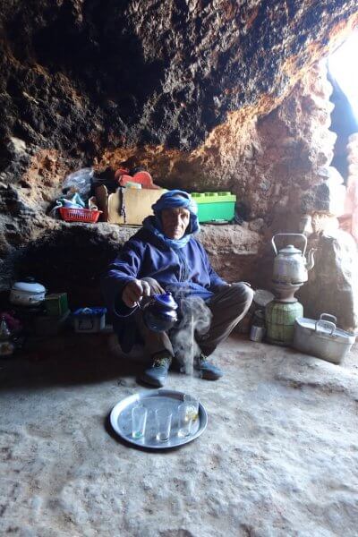 Les nomades habitent dans les roches. Trois ou quatre pièces troglodytes, où vit cette famille de 8 personnes. Tout se passe en berbère. Abdou me confiera ensuite qu’il connaît la famille depuis 10 ans et passe de temps à temps prendre le thé ainsi. Tout est simple, spontané.