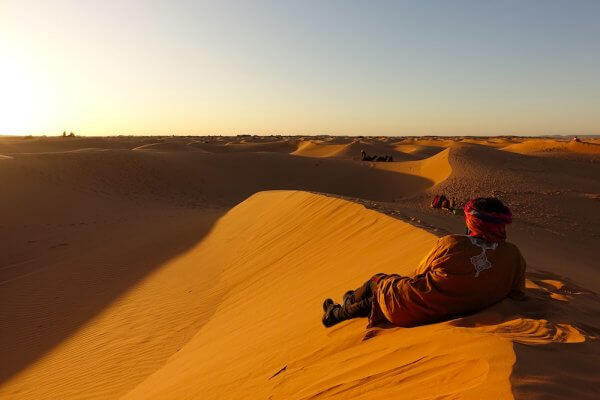 Face au coucher de soleil sur ce majestueux Sahara. Je n’arrive pas à savoir si le tourisme à Merzouga est une bonne chose. Je ne suis personne pour le décider. Ce tourisme fait vivre de nombreuses personnes, c’est certain. Mais ils abîment, je suppose, sol et ressources. Ce tourisme peut-il sensibiliser aux beautés de notre monde ? Ça je ne peux le savoir.