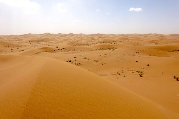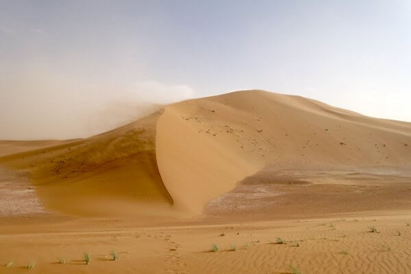 Nous faisons face à la dune de 300 mètres de haut, il est encore temps de rentrer. Évidemment, je ne rentre pas. La montée est rude, le vent ne faiblit pas. Arrivée en haut, je peine à tenir debout et dois me mettre à quatre pattes à plusieurs reprises. Vue superbissime. Des dunes à perte de vue. Des dunes si douces, si douces. Je reviendrai, je le sais.