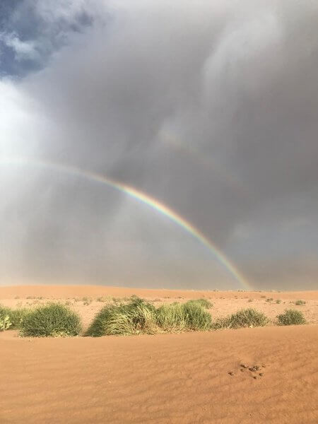 Je dois hélas déjà reprendre la route, escortée par un inédit arc-en-ciel qui ferme le chapitre de cette journée saharienne aussi courte que superbe.