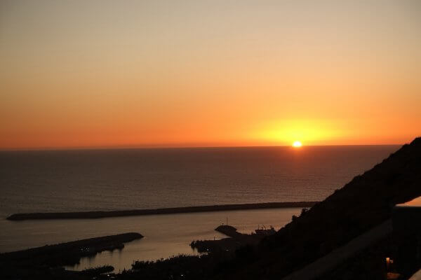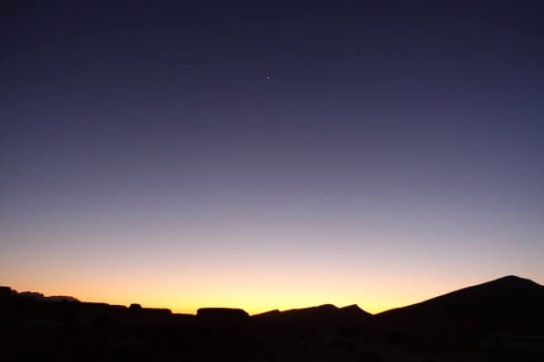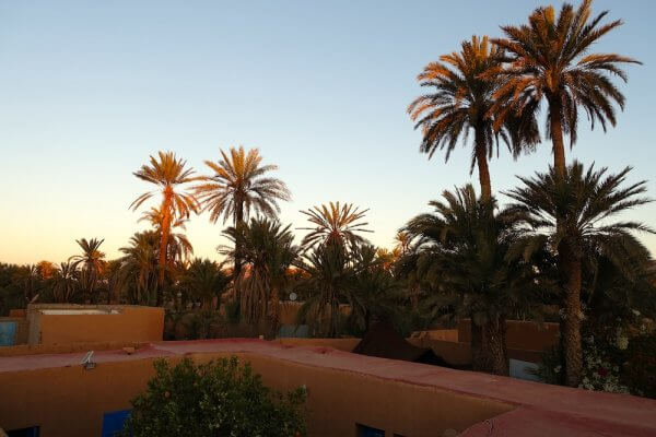 Lever de soleil sur la palmeraie avec le rose qui gagne de branche en branche à chaque instant. Les oiseaux autour s’agitent. À part eux, calme et sérénité absolue.